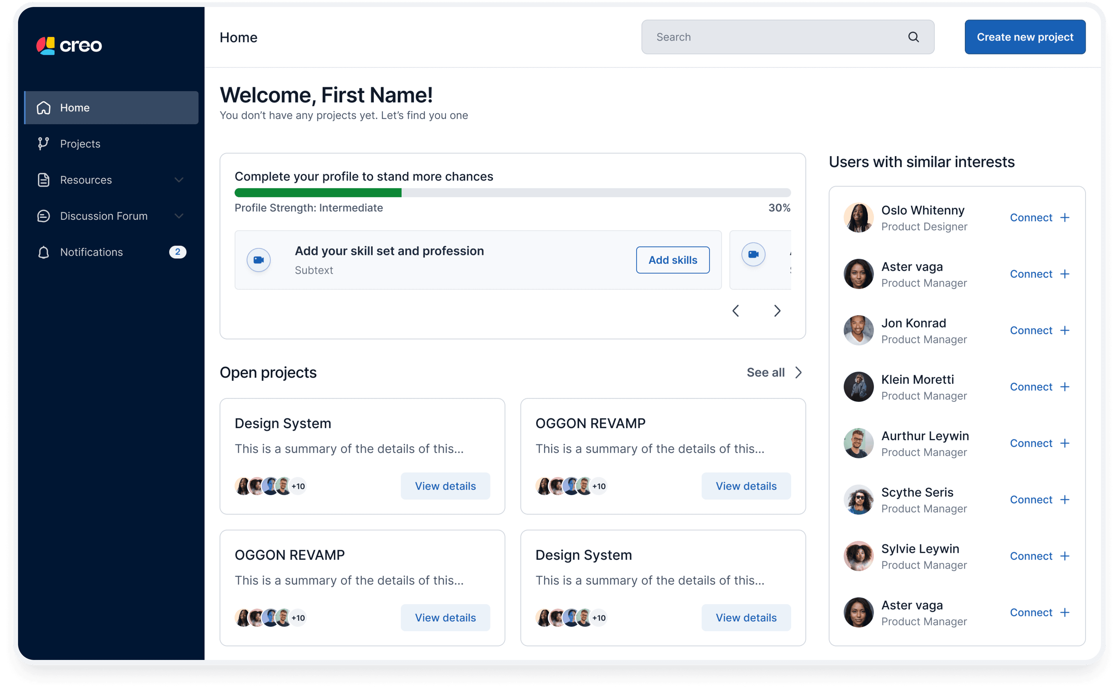 Creo connects you with like-minded peers to collaborate on live projects for your portfolio and sharpen your skills under the supervision of seasoned industry experts.